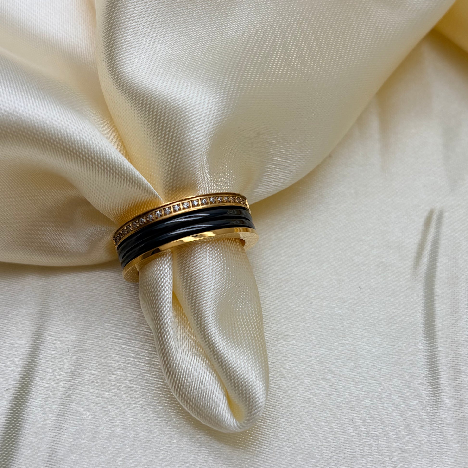 Anillo en acero y tungsteno negro con dorado con piedras