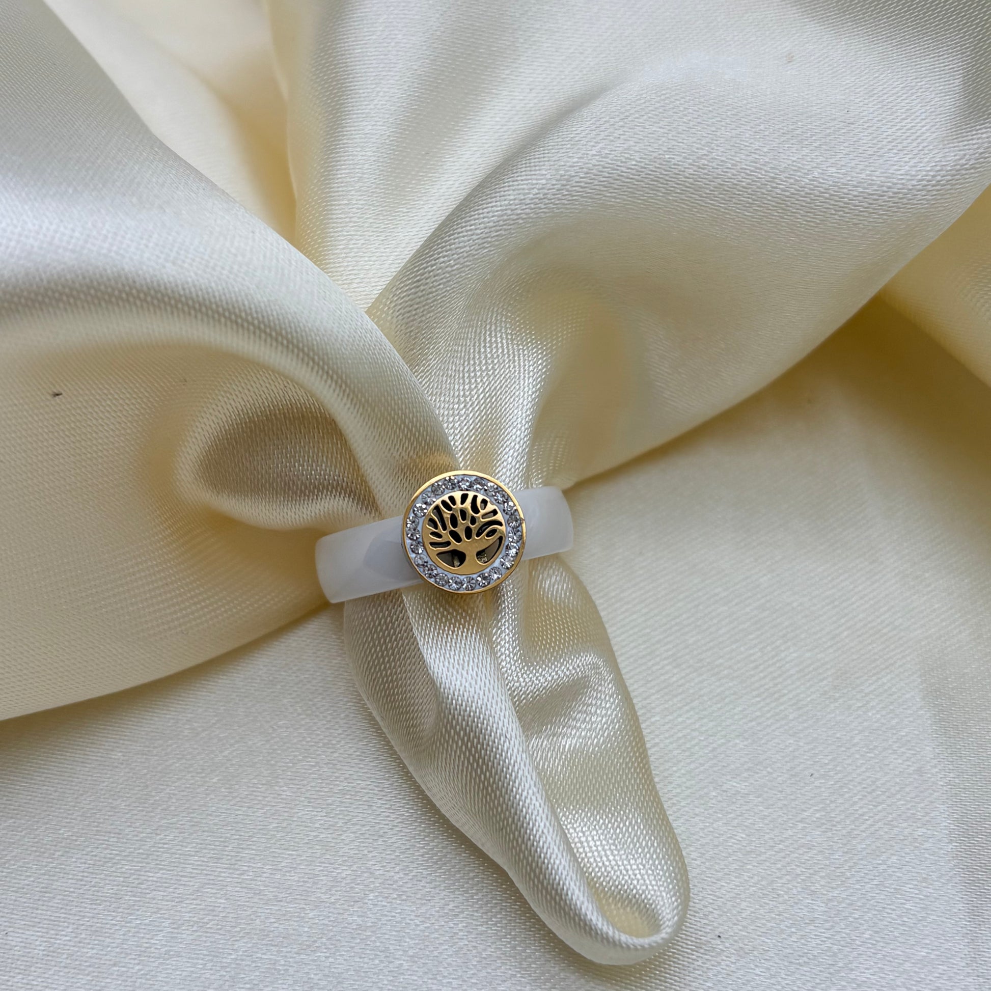 Anillo en acero y tungsteno blanco con dorado y piedras