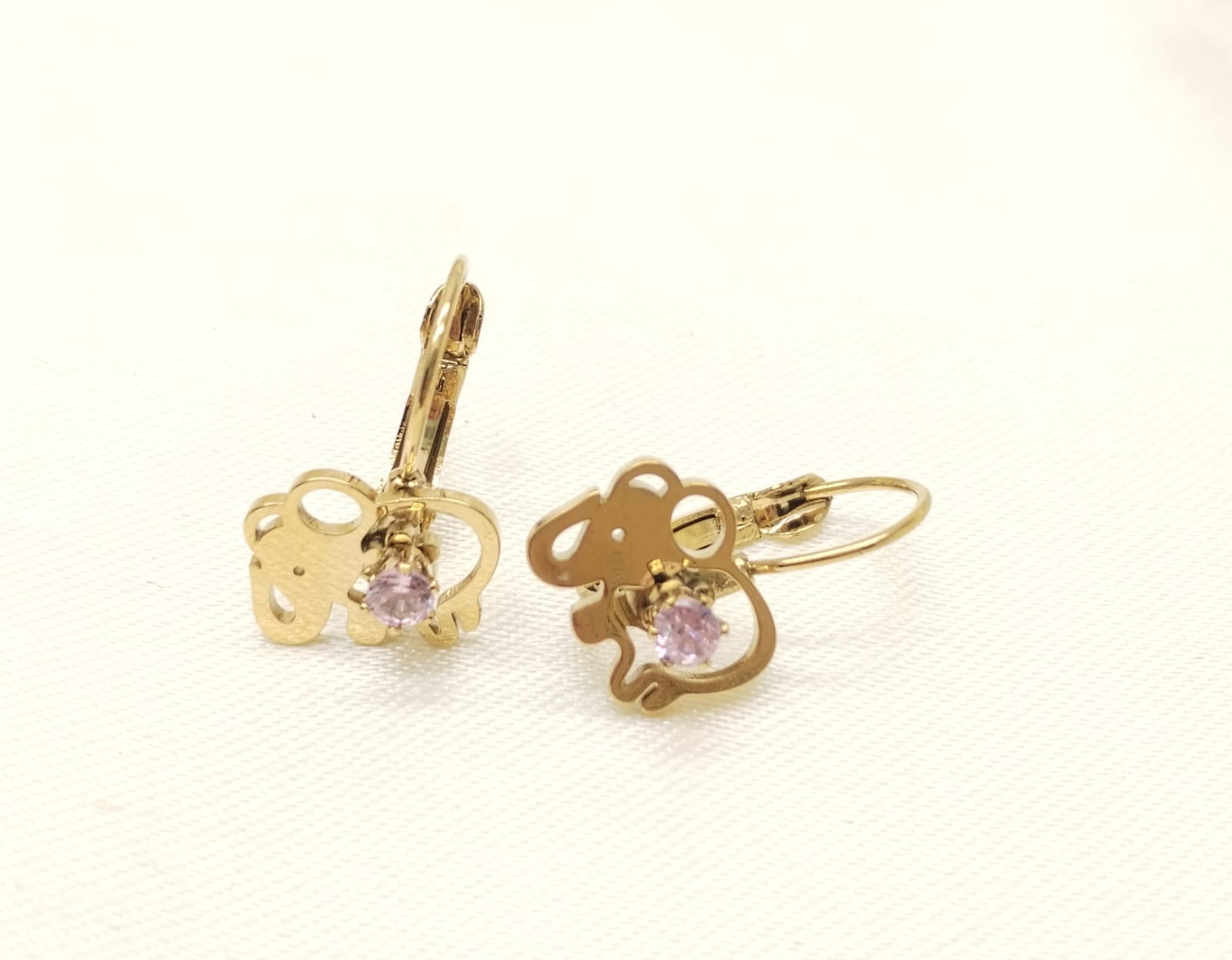 Arete en acero dorado en elefante con piedra rosa