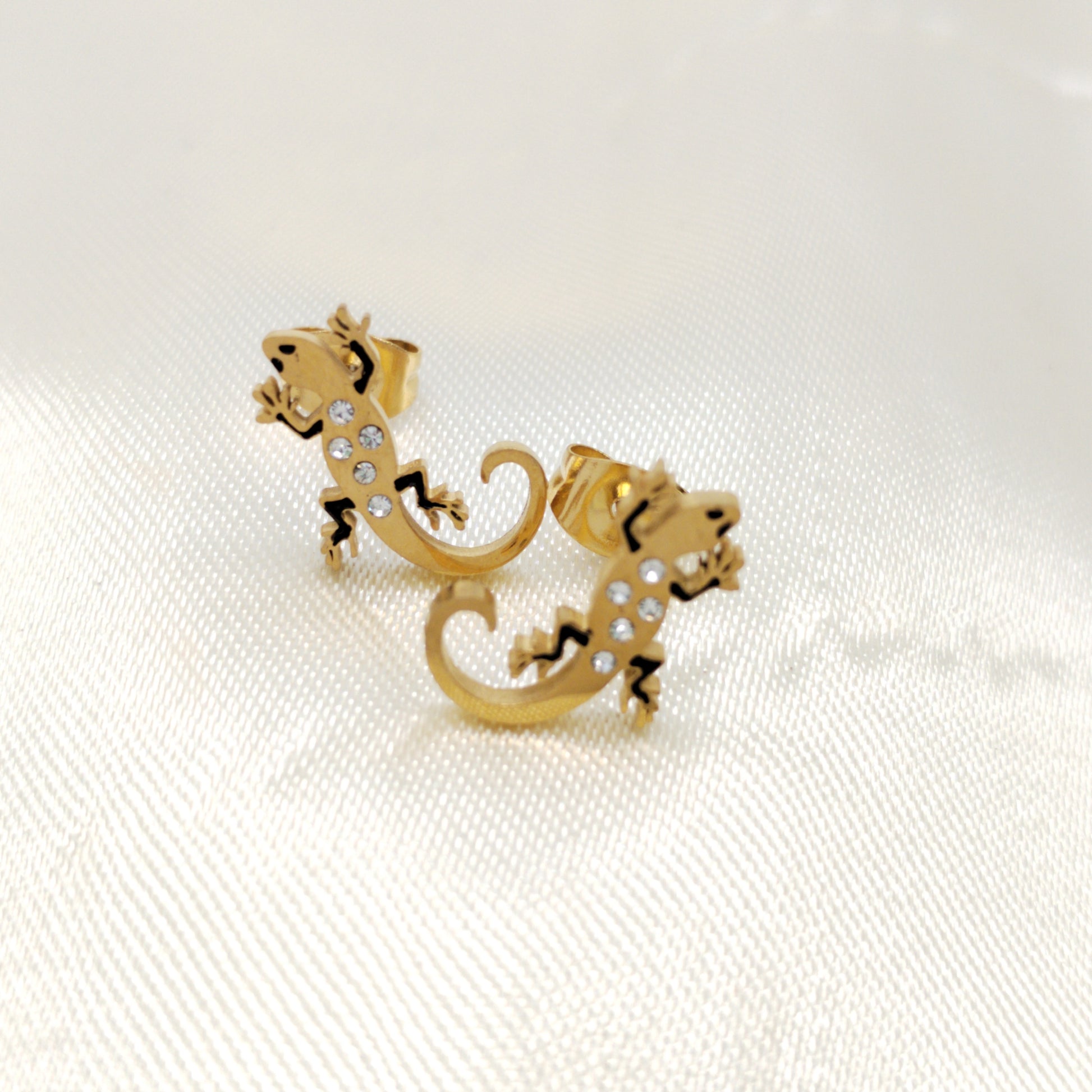 Arete en acero dorado de lagartija con piedras